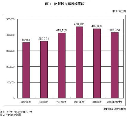 肥料総市場規模は2005年度あたりまで概ね横ばいから微減で推移していたが、2008年の肥料価格高騰前の駆け込み需要で2007年度と2008年度は拡大傾向にあった。その後、肥料価格高騰が農家の経営を圧迫していることから、土壌診断による適正施肥や堆肥などの利用が進んでいる。そのため、化学肥料の施肥量は減少しており、2009年度は縮小した。