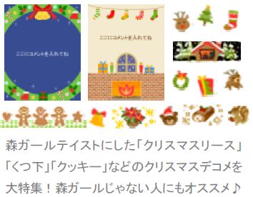 コンテンツ内容:森ガールテイストにした「クリスマスリース」「くつ下」「クッキー」などのクリスマスデコメを大特集!森ガールじゃない人にもオススメ♪