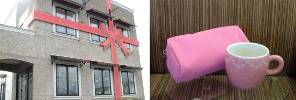 (写真右:いずれもイメージカラーのピンク。ロゴ型押しのポーチと、マグカップ)