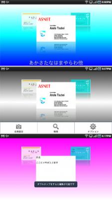 特徴として、名刺画像のコントロールをフリック操作で行い、左右への送りや上下方向へのフリックで名刺画像反転、ダブルタップでの拡大、縮小などが行えます。