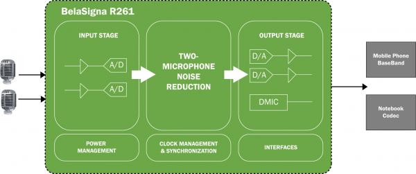 BelaSigna R261 SoCは、デジタル・マイクロフォン・インタフェース(DMIC)またはベースバンド・チップのマイクロフォン入力に直接プラグインするだけです。コスト重視のOEMデザインでは、安価な無指向性マイクロフォンを使用でき、マイクロフォン配置の自由度が大きくなります。プロダクション・ラインでのマイクロフォンの調整が不要で、時間とコストが節約されます。