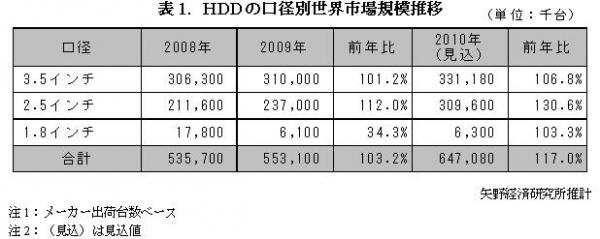 2010年のHDD市場は数量ベースでは前年比117.0%で拡大し、6億4,708万台の見込みである。2010年第1四半期から第2四半期は、好調だった2009年第4四半期と比較して販売量が減少し、メーカー各社は生産を抑制しながら在庫を捌く形になった。しかし、2010年第3四半期以降、新興国を始めとする世界的なノートPC市場の好調により2.5インチHDDの販売が大きく伸び、メーカー各社は増産体制に戻り通年では市場が拡大すると予測する。こうした動向に伴い、HD(メディア)、磁気ヘッド市場も拡大傾向にある。