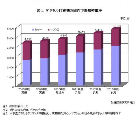 2009年度のデジタル印刷機(商業用及びトランザクション用途の無版デジタル印刷機)の国内出荷台数は4,590台(前年度比103.4%)となった。出荷台数ベースで市場の大半を占めるMFP(Multi-Function Printer)メーカが、自社の得意分野である官公庁や大企業の集中コピー室やマニュアル印刷などの企業内印刷需要開拓に努めた結果である。