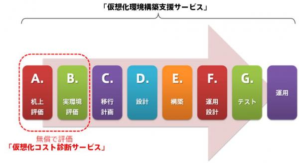 「仮想化コスト診断サービス」は、「仮想化環境構築支援サービス」の1つで、下記の二段階のステップを無償でご提供いたします。