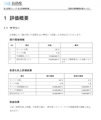 まず仮想化に掛かるコスト、仮想化した後のサーバ台数や削減できるコストの割合などを試算した机上評価報告書を提出いたします。ユーザー企業に下記の項目を提供いただき、物理サーバを仮想化した場合の試算を行います。