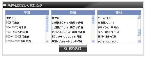今回サービスを開始するECサイトのシステム構築については「予算×特徴×商材」の3軸で検索することが可能に