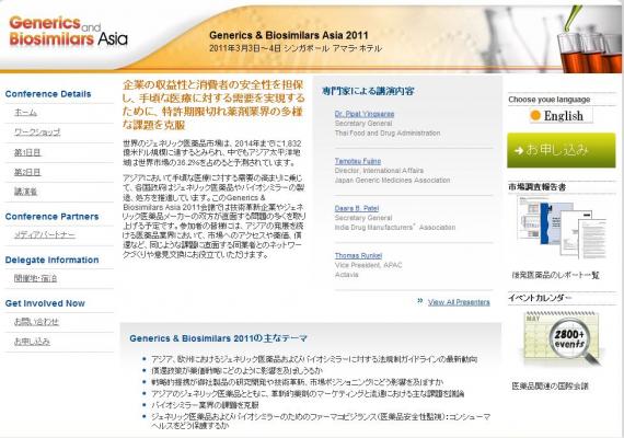 「Generics & Biosimilars Asia 2011」の情報を提供するとともに、会議の参加のお申し込みを承っております。