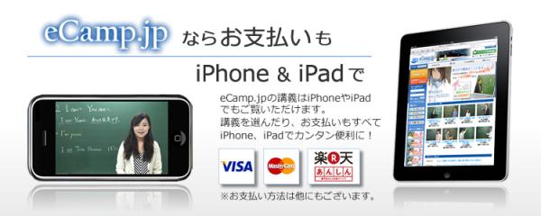 eCampでは中学生の英語・中学生の数学・中学生の国語を中心としたインターネット映像授業(1500コンテンツ)が、PC(ブロードバンド)での視聴と同様にiPhone、iPadで視聴可能です。決済機能のiPhone 、iPadでの提供により、全てのサービスがPCと同様に利用可能となります。会員登録(無料)⇒講義の購入の申込(決済)⇒映像授業の視聴までノンストップソリューションで提供いたします。決済手段には通常のカード決済に加えて『楽天あんしん支払いサービス』も含まれます。iPhone、iPadでの利用方法はeCampのTOPページから確認願います。また実際の授業のサンプル動画をご覧になりたい方は<http://www.ecamp.jp/lecture.html/view/387> の画面で「サンプル動画を見る」のボタンをクリックしてください(サンプル動画は受験の季節にピッタリの齋藤先生の「日本列島縦断公立高校入試問題研究 数学編)です。PCに限らずiPhone、iPadでも鮮明なインターネット映像授業がご覧になれます。