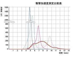 下記の波形図は3.8Kgの試験荷重具(人頭模型2.5kg+器具1.3kg)を150cmの高さから落下させたときの衝撃吸収性能を測定したものです。 ヘルメットの衝撃吸収素材と比較してもその優秀性は一目瞭然。対衝撃吸収パッドは何も無い状態と比較すると約90%の衝撃を吸収しています。