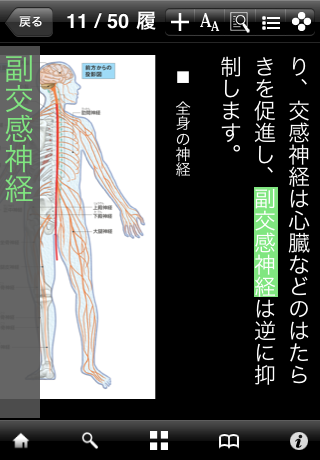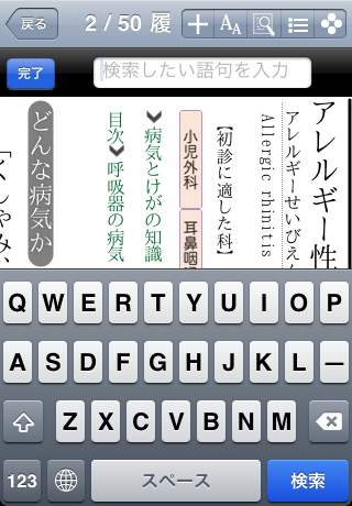LogoVista電子辞典で培った検索方法を継承。前方一致/後方一致/完全一致/部分一致/全文検索といった豊富な検索オプションを利用できます。文字を入力すると候補見出し語が表示されるインクリメンタルサーチ、検索結果に表示された本文中の用語をなぞることでそのまま連続辞書引きも可能。また、マルチタッチによる拡大やセンサーによる画面の回転にも対応しています。