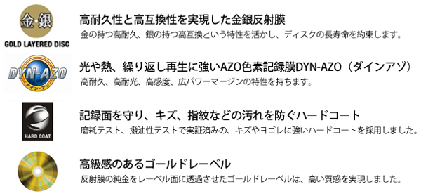 また、記録層には、当社が開発した、光や熱に強く、繰り返し再生に強いAZO色素の「DYN-AZO(ダインアゾ)※3」を採用しました。金銀反射膜との相乗効果で、信頼性の高いディスクです。さらに、記録面にはハードコートを塗布し、キズや指紋などからディスクを守ります。