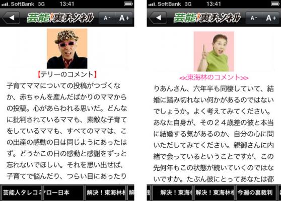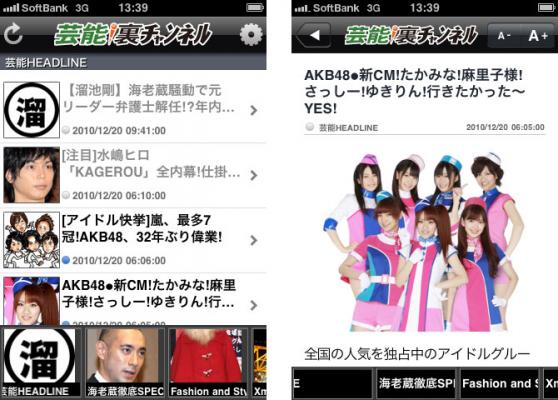 iPhoneアプリ版『芸能!裏チャンネル』では、イースト株式会社の記事配信システム『記事蔵』を使うことで携帯サイトで配信中のコンテンツをほぼまるごと配信しています。さらに、iPhoneの特徴でもある大画面、高画質を最大限に活かし、最新芸能ニュースを高画質の写真付で配信します。