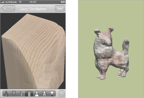 PHYZIOS Sculptor ProはiPhoneのスクリーンをタッチして彫刻を掘るアプリケーションです。厳選された7つの道具(ドリル、ノミ、 ナイフ、ヤスリ、パテ、フリーハンド、ライト)を使用しオリジナルの彫刻を作成することができます。