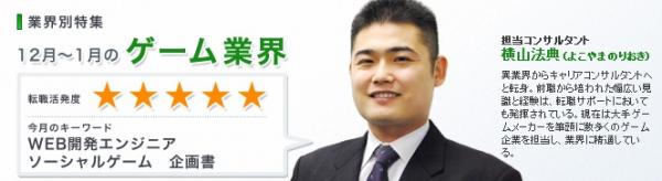 ソーシャルゲーム業界からの引き合いが強まったことから、WEB開発エンジニアの争奪戦はしばらく続くものと思われます。他職種についても採用拡大が予想され、プランナー・ディレクターであれば企画書、デザイナーであれば作品、プログラマーであれば簡単な作品やソースコードといった「履歴書と職務経歴書以外のアピール」をしっかりと準備しておくことが転職を成功に導く鍵となりそうです。