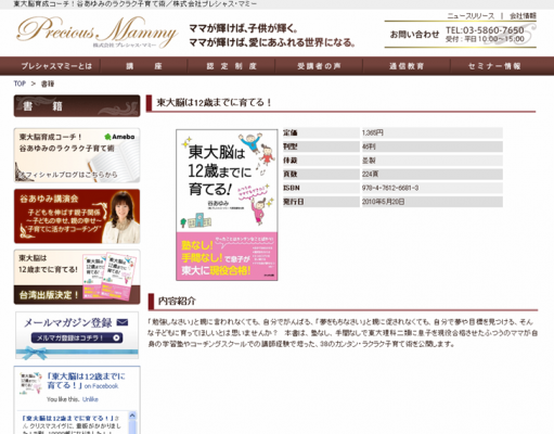 母親を対象とした子育て、親育てスクールの運営、女性を対象としたセミナーを開催している株式会社プレシャス・マミー (本社 東京都港区 代表取締役社長 谷あゆみ 以下プレシャス・マミー)の代表、谷あゆみの著書「東大脳は12歳までに育てる!」(かんき出版)が4度目の重版で、5刷になりました。詳しくは、弊社コーポレートサイト (http://www.precious-mammy.com)をご覧ください。