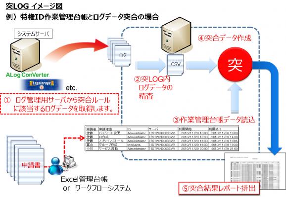 特権IDの利用毎に発生する申請/承認フローに伴う申請書とその実際の対象ログデータを設定されたキー項目を読み込み突合(とつごう)し一覧にし、監査レポートとして提供いたします。