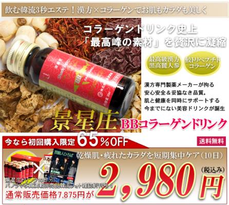 モニター調査にて96%の方が効果を実感!最高級漢方黒高麗人参と鮫トリペプチドコラーゲンを含有した世界初の美容健康ドリンク「景星庄BBコラーゲンドリンク」をこの度初回購入者様限定2980円(65%OFF)にて販売致します。今までに経験したことない高いキレイサポート効果を是非ご体験下さいませ。
