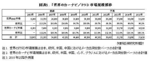 世界のカーナビ市場規模は2010年980万台(メーカ出荷台数ベース)、その後2010~2015年の年平均成長率が10.7%と今後も堅実に成長を続け、2015年には1,632万台に達すると予測する。この背景には、中国における低価格なSDカーナビ市場の急成長によるところが大きいことが挙げられる。