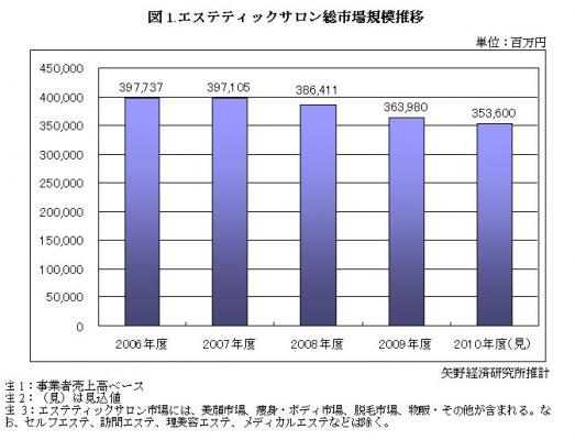 2010年度のエステティックサロン総市場規模は、前年度比97.1%の3,536億円と見込む。長引く景気後退の影響を受けて、来店サイクルの長期化や客単価の減少が進んだことに加え、他のリラクゼーション関連市場や美容関連市場との競争激化、規制強化による信販問題などの要因から、市場縮小が進んでいる。