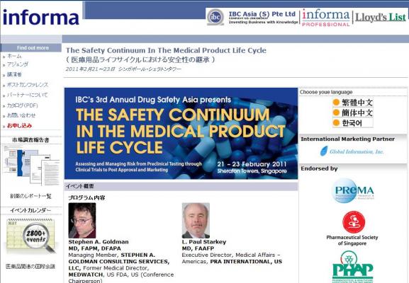 株式会社グローバル インフォメーションでは、皆様の利便性を図る為に、日本語、韓国語、中国語で「The Safety Continuum In The Medical Product Life Cycle(医療用品ライフサイクルにおける安全性の継承)」の情報を提供するとともに、会議の参加のお申し込みを承っております。