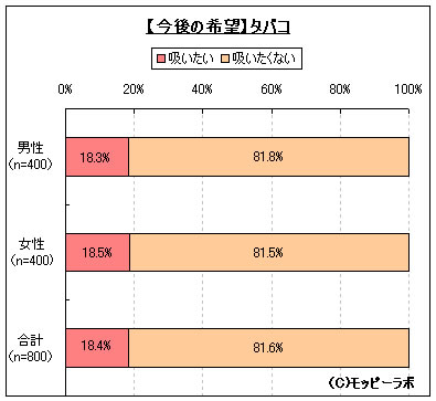 新成人に対して「喫煙意向」についてモバイルリサーチで聞いたところ、全体の81.6%が「吸いたくない」と回答した。タバコ料金の値上がりや喫煙スペースの減少など、喫煙者にとっては肩身の狭い世の中となりつつあることもあり、新成人での喫煙意向は低い結果となった。