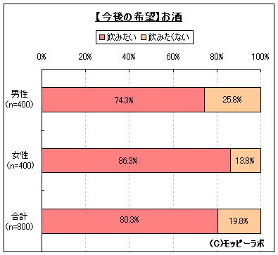 また、同様に「飲酒意向」についてモバイルリサーチで聞いたところ、全体の80.3%が「飲みたい」と回答した。性別で比較すると、男性の74.3%、女性の86.3%が「飲みたい」と回答し、女性が男性よりも10ポイント以上高い結果となった。最近では女性をターゲットとしたアルコール飲料も多数発売されており、また、「草食男子」「肉食女子」と称されるように女性が元気な時代であることの表れかもしれない。タバコとお酒に関しては、「タバコ増税」、「肉食女子」と近年の世相を反映する形の結果となった。