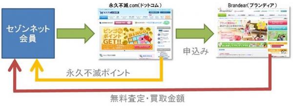 「永久不滅.com」を通じて、デファクトスタンダードの運営するブランド品宅配買取サービス「ブランディア」へ無料査定申込されたお客様に対し、永久不滅ポイントを付与いたします。クレディセゾンは、「永久不滅.com」サイト内に新たに「買取で貯める(仮)」コーナーを新設。「永久不滅.com」会員の持つ“不用品売却”の潜在的ニーズの掘り起こし、「ブランディア」の認知拡大・利用促進へ繋げます。また、お客様に“不用品売却”によって得た永久不滅ポイントで再度ショッピングを楽しんでいただき、市場全体を活性化させることも目的としております。
