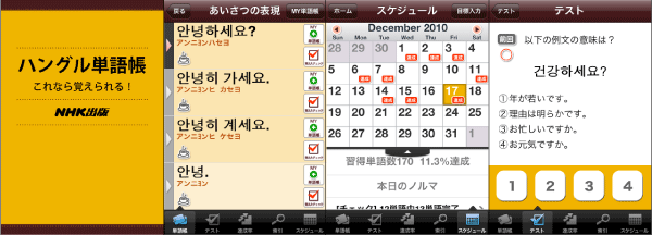 本単語帳は、NHK出版が出版し、人気を博している「CDブック これなら覚えられる!」シリーズの「ハングル単語帳」のiPhone版アプリです。日常で使用頻度の高い単語約1500語と、その例文約800を品詞別や場面・トピック別に収録。チェックした単語はテストで確認することができるので復習もできます。ネイティブ・スピーカーによる音声付きで、リスニング効果も抜群*。ハングルの読みも表示していますので、ハングル初心者でも安心して学習できるアプリになっています。また学習進度や達成状況の確認、リマインダー機能による通知、スケジュール管理などの機能も充実しており、学習のペースメーカーとしても役立ち、いつでもどこでもちょっとした空き時間を有効に活用できる、学習マネジメント機能を備えた語学学習アプリとなっています。