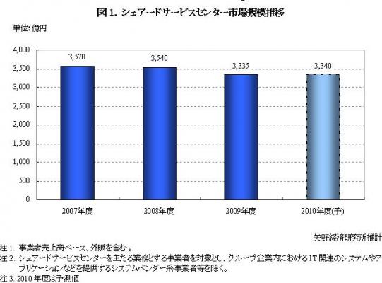 2009年度のシェアードサービスセンター市場規模は前年度比5.8%減の3,335億円(事業者売上高ベース、外販を含む)であった。2000年以降、シェアードサービスセンターの設立が相次ぎ、参入事業者も増加傾向にあったが、リーマン・ショック以降の不況の影響を受け、同市場は縮小した。
