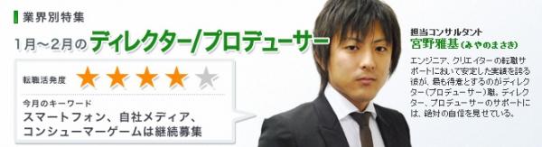 12月も、ディレクター・プロデューサーの採用は好調でした。モバイルやゲームでは、ソーシャルゲームやスマートフォンの活況に連動した新規求人が目立ちます。特にモバイルでは、受託業務中心だった広告代理店やモバイル中心の制作会社がソーシャルゲーム・アプリやAndroid・i Phoneのコンテンツ提供を開始しており、全体の求人数が前月比で20%増加しました。グリー株式会社がスマートフォン向けプラットフォーム(GREE Platform for smartphone)を公開したことなどからも、業界全体でスマートフォン関連に注力していることが伺えます。