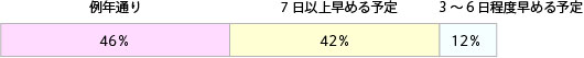 例年は3月~4月前半が母の日用仕入れのピーク。2011年の母の日は5/8(日)で、直前の3日(火)、4日(水)、5日(木)が3連休と販売側には厳しい曜日回りとなる。そのため昨年より仕入れ時期を早めるという回答が過半数を占めました。