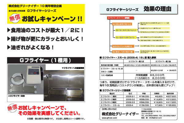 弊社製品食用油酸化抑制装置Gフライヤーをお試しで無償貸出を致します。