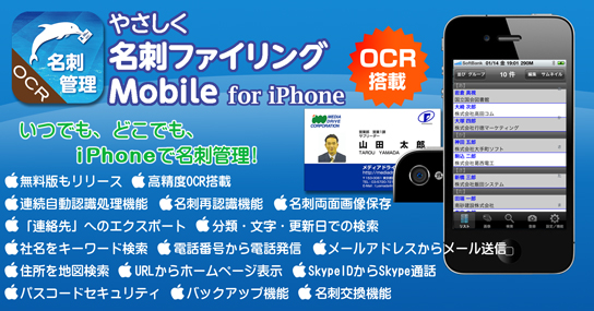 「やさしく名刺ファイリング Mobile」はiPhoneのカメラで撮影した名刺を文字認識(OCR)※し、データベースとして名刺を管理することができるアプリケーションです。