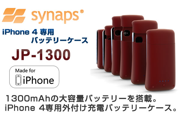 株式会社グローバルコネクション(本社・埼玉県朝霞市)は2月2日、携帯アクセサリーの総合ブランド「synaps」(シナップス)から、iPhone4向け補助バッテリー付きケース「JP-1300」を発売する。長持ちする充電と使いやすいデザインが特徴。全国の家電量販店、大手専門店、国際線空港内ショップ、インターネットのショップなどで購入できる。
