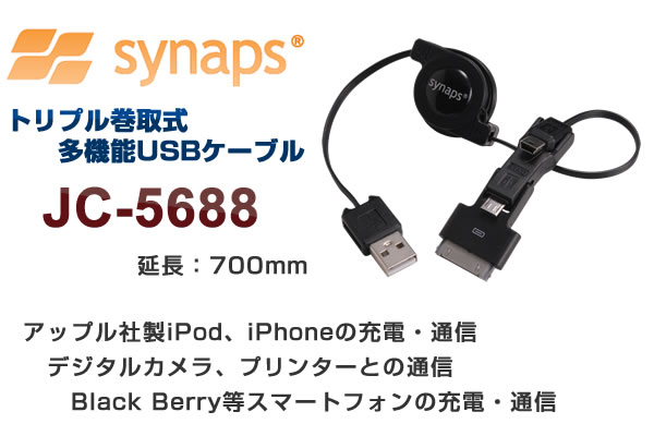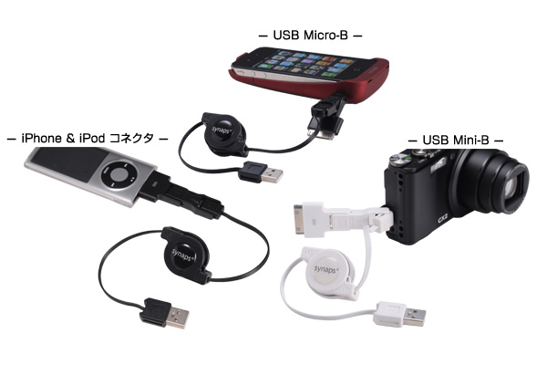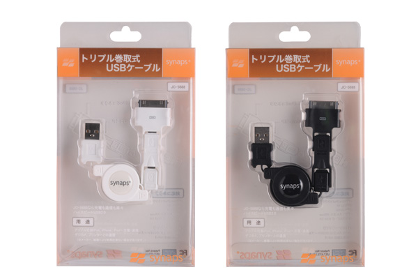 携帯アクセサリーグッズのブランド「synaps」を展開する株式会社グローバルコネクション(本社・埼玉県朝霞市)は2月2日、「Apple Dockコネクタ」、「USB Mini-B」、「USB Micro-B」の3種類の端子を備えたトリプル巻取式多機能USBケーブル「JC-5688」を発売する。iPod、iPhoneからデジカメ、スマートフォンまで、1本で多様な機器をパソコンにつなぐことができる。