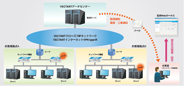 VOSS(VECTANT Online Support System)とは、弊社が提供するWebベースの監視、工事・障害通知サービスです。お客様側で設備を持つことなく、効率的な監視・運用体制を構築していただけます。