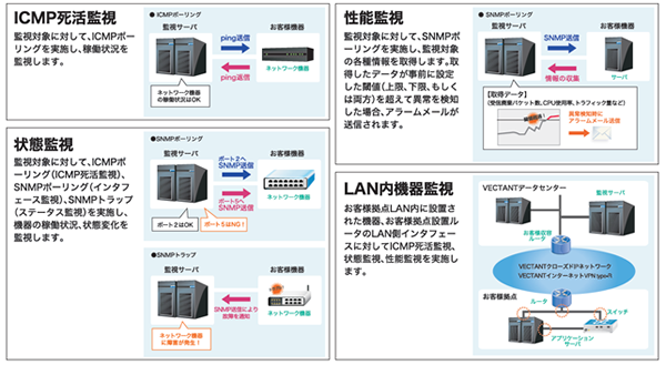 本サービスは、Webベースの監視、工事・障害通知サービスです。本サービスでは、ネットワーク機器からサーバまでを、24時間365日一元監視。お客様の目的に応じた監視内容を選択可能です。障害発生時には、VOSSからの通知により迅速な障害対応が可能となります。
