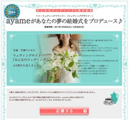 フリーウェディングプランナー(ウェディングデザイナー)ayameが、あなたのご予算に合わせて、あなたの夢の結婚式を無料でプロデュースします。応募時に記入する、結婚エピソード、応募理由等から、想いの熱い1組のカップルをみんなのウェディングとayameが選考させていただきます。