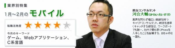 スマートフォン向けアプリ市場のニーズ拡大に伴い、Web系開発者とは別にスマートフォンの開発担当を置く動きが見られるようになりました。インターネット上でのWebアプリ開発経験を最低限の応募条件としてPHPを重視する傾向が変化し、C、C++、Javaといった言語のゲーム及びアプリ開発者に対する評価が高まりつつあります。Wii・Xbox360・PS3といった家庭用ゲームのソフト開発者などには転職の好機となりました。