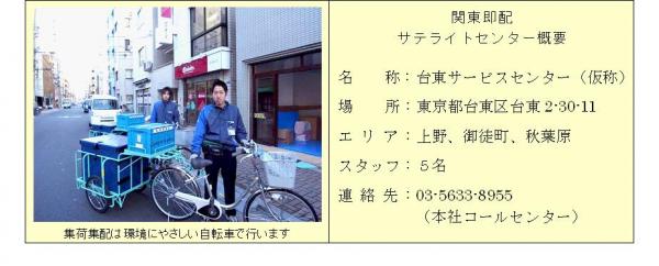 今般、開設したサテライトセンターはアメ横や秋葉原電気街に近い立地で、5名のスタッフにより上野・御徒町・秋葉原エリアの企業・店舗をカバーします。また、車両を使わず集配効率を高めるリヤカー付電動自転車を導入し、環境にやさしく、渋滞の緩和にもつながる集配システムにしました。