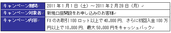 詳細はホームページ(http://www.fxonline.co.jp/campaign/fx-cashback201101.html)をご覧下さい。