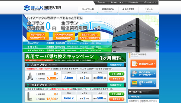 2010年12月1日より実施しております、他社レンタルサーバから、「BULK SERVER」へ乗り換え頂いたお客様を対象にした、「サーバ乗り換えキャンペーン」ですが、キャンペーン開始以降大変多くのお客様にご利用頂いていることから、この度、本キャンペーン期間を2011年3月31日まで延長することを決定いたしました。