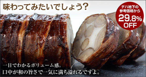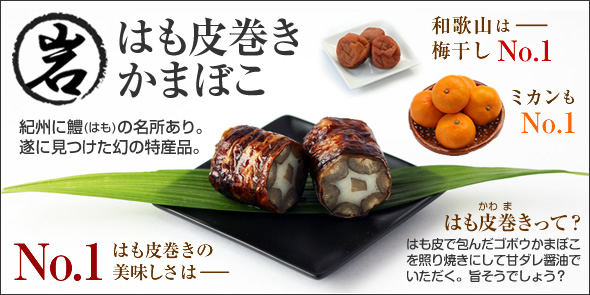 『鱧(はも)皮巻き かまぼこ』[http://kawamaki.com/]は、この味一筋五十五年の専門店「岩畑商店」が提供する手作り惣菜です。和歌山の和歌浦は鱧(はも)が名産品であり、『はも皮巻き』はこの地域に伝わるご当地グルメ特産品なのです。