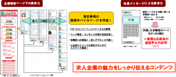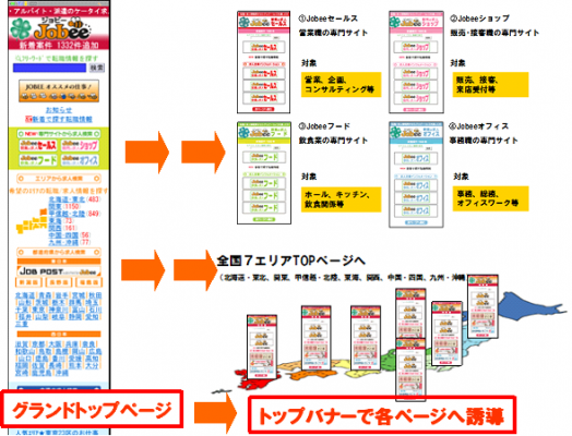 このたび、より専門特化し、訴求力もより一層向上させることで求人企業側・求職者側双方にとって顧客満足度の高いサービスを提供することを目的として、4つの専門サイト(「Jobeeセールス」「Jobeeショップ」「Jobeeフード」「Jobeeオフィス」)を「Jobee」内に増設するとともに、(1)バナー広告の提供、(2)社長インタビューコンテンツの製作および掲載、といった各種オプショナルサービスを導入することで、掲載企業の訴求力とターゲティング性の向上、ユーザーにとっても企業のビジョンや特徴などを踏まえた応募が可能となるなど、求人企業側、求職者側双方のニーズに対応した魅力的な内容となっております。