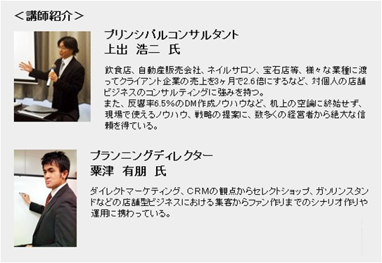 本ワークショップは、いかに新規のお客様を集客し、リピーターへと育成させていくかについて、話題のフラッシュマーケティングや、実際に現場で行われている新規開拓の手法、リピーター獲得の手法について、業界最新の新鮮な情報をお伝えしつつ、参加者間で闊達な情報交換を行っていただきます。他店舗での取り組みを参考にし、新たな施策を考案する場合や自店舗で取り組んでいる施策の確認を行うこともできる貴重な勉強会となります。