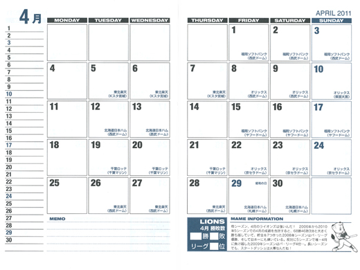 12球団が一斉にキャンプインし、2011年シーズン開幕まであと50日。ライオンズとともに1年を過ごすファンの皆様に贈る埼玉西武ライオンズ初の「2011シーズン手帳」が発売されました。セ・パ交流戦を含めた公式戦全144試合はもちろん、オープン戦や日本シリーズの日程もマンスリー&ウイークリーページに記載されており、観戦スケジュールを立てやすい構成となっています。