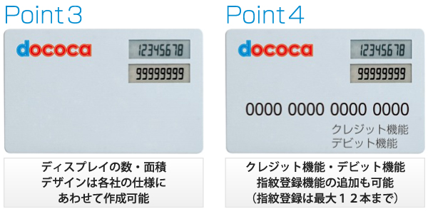 機能:8 桁(最大16 桁まで)の数字・アルファベット・記号(特殊文字)の表示、ディスプレイ数・面積、デザインは各社の仕様に合わせることが可能、クレジット機能/デビット機能、機能ロック、テンキーや「OK」「キャンセルキー」の追加、指紋登録機能(最大で12 本まで登録が可能)