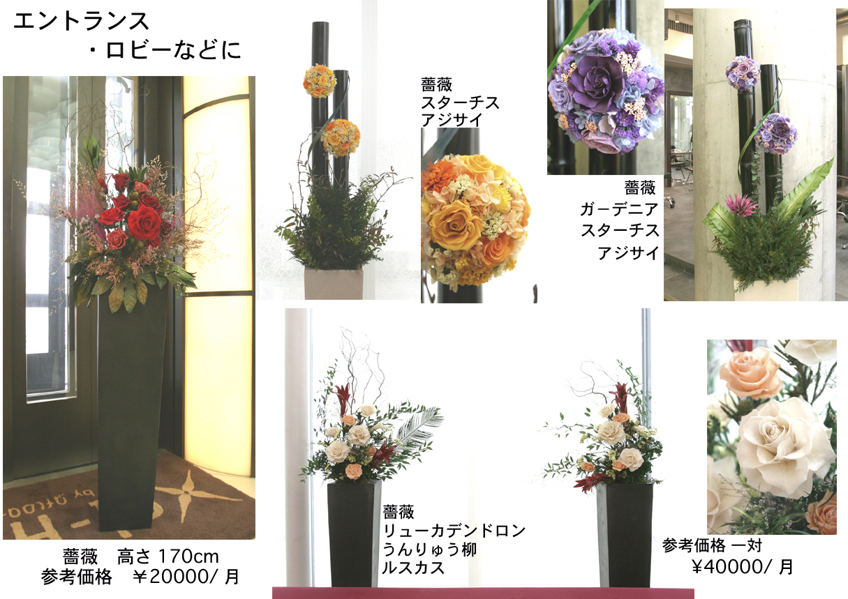 いままで、個人レベルの高級贈答品でしかなかった、プリザーブドフラワー(生のお花を自然な薬剤で加工し、生きたままの姿が数カ月つづくという、枯れない花)の法人向け実用化に成功、60cm~2m大のお花のいけこみの法人様へレンタルを行っております。この度、難しかった南国の葉や、枝など高度な加工技術が必要な花材料を2年かけ、開発の結果、プリザーブドフラワーとして商品化することに成功いたしました。今までのプリザーブドレンタルでは高級ホテル、ミシュランレストラン、外車ショールーム等での御導入されておりますが、さらに新しい花材料を加え、春には博物館展示なども予定しております。業界初の巨大プリザーブドフラワーで、あなたの店舗、イベント会場、撮影などにおいて造花にはない本物の高級感、生花の半分のコストでお手伝いをさせていただきます。