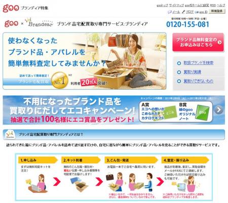 「goo×ブランディア」は、デファクトスタンダードが提供するブランド宅配買取りサービス「ブランディア」とサービス提携し開設する特設サイトであり、ユーザは不要になった約2600種類以上のブランド品を送料などすべて無料で買い取ってもらうことが「goo」上からもできるようになります。