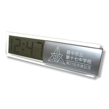 「人間尊重の精神に基づき」を教育目標に掲げる大阪府の中学校が卒業記念品として制作。日常的に使える身近なアイテムであることからデジタルクロックを選定。卒業生と父兄の皆さん、ご卒業おめでとうございます。
